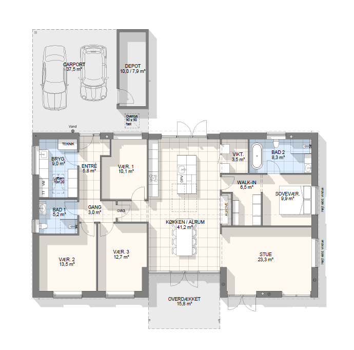 Classic-stilen trækker på de bedste elementer fra dansk parcelhusarkitektur: sadeltag, klassisk facadeopbygning og en arkitektur, der falder naturligt ind i de fleste villakvarterer. Udtrykket er roligt, velkendt og tidløst – men bag facaden gemmer der sig moderne rumforløb, dagslys og fleksible muligheder.