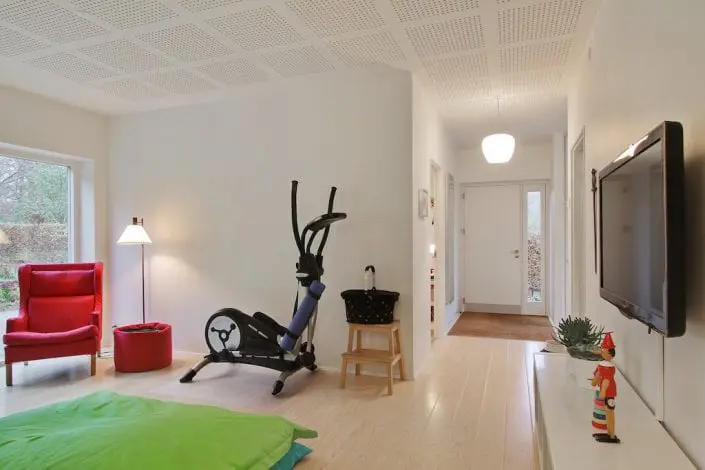 Vi anbefaler akustiklofter og bløde materialer, som dæmper lyd og skaber en behagelig atmosfære – især vigtigt i børnefamilier.