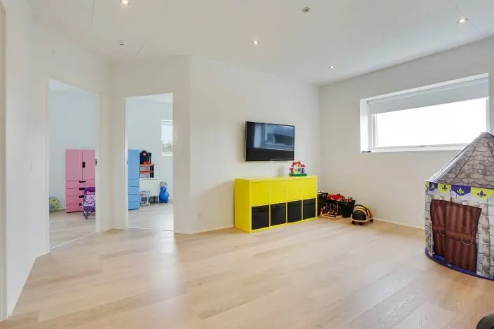 Et multirum er perfekt som legerum for de små, lektiezone for skolebørn eller loungeområde for teenagere. I mange af vores plantegninger er multirummet placeret centralt i værelsesafdelingen, så børnene har deres egen base – uden at være for langt væk. Rummet kan åbnes op eller lukkes af med skydedøre, så det tilpasses behovet for ro eller fællesskab. Det er en oplagt løsning til familier, der ønsker plads til både nærvær og privatliv.