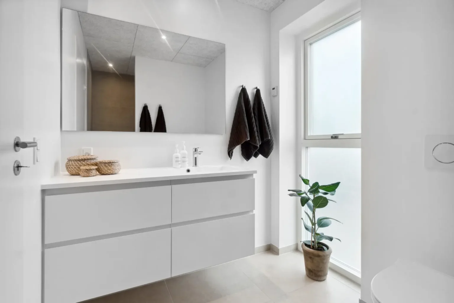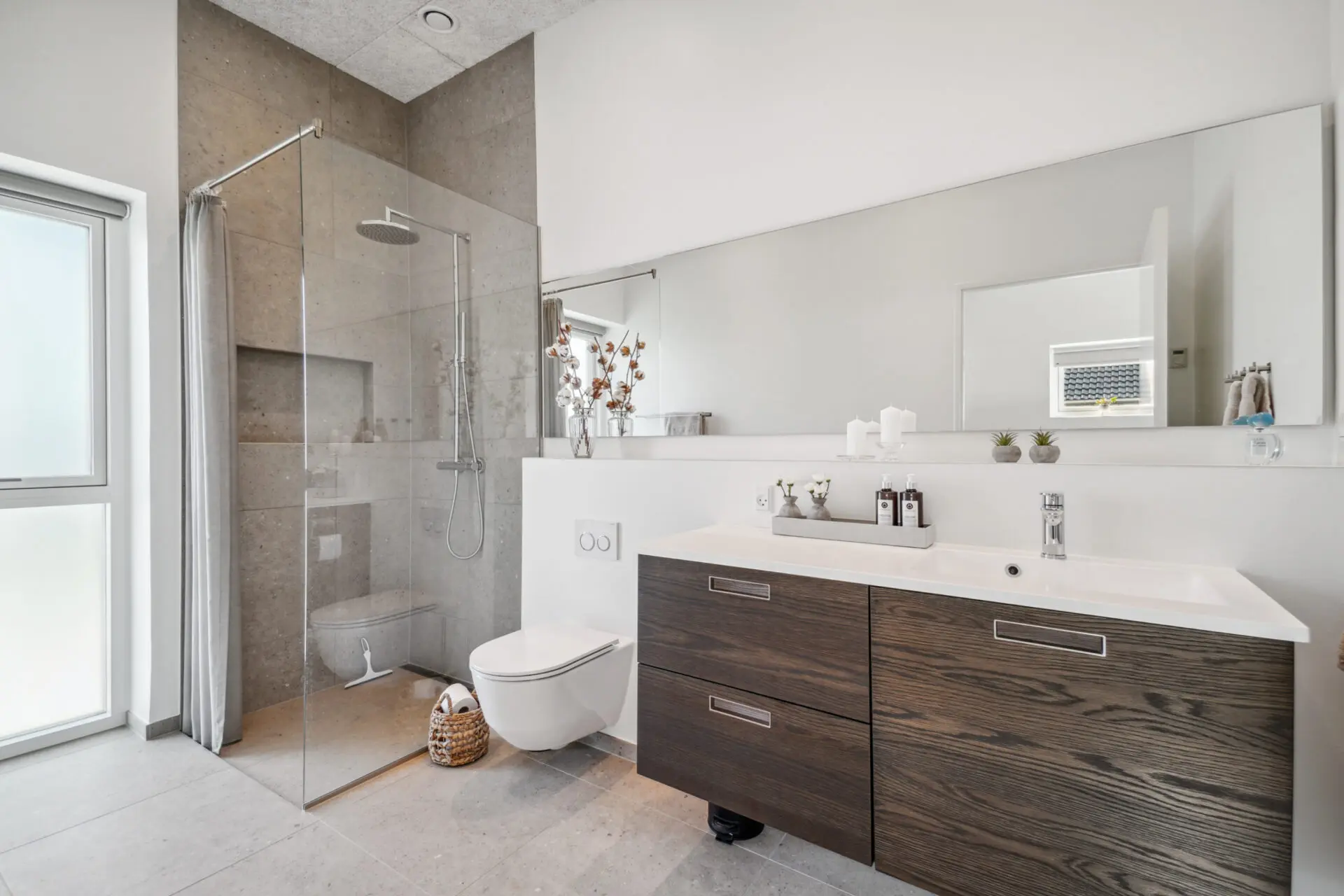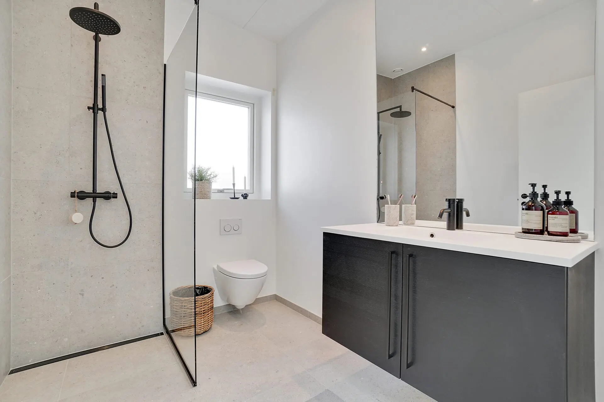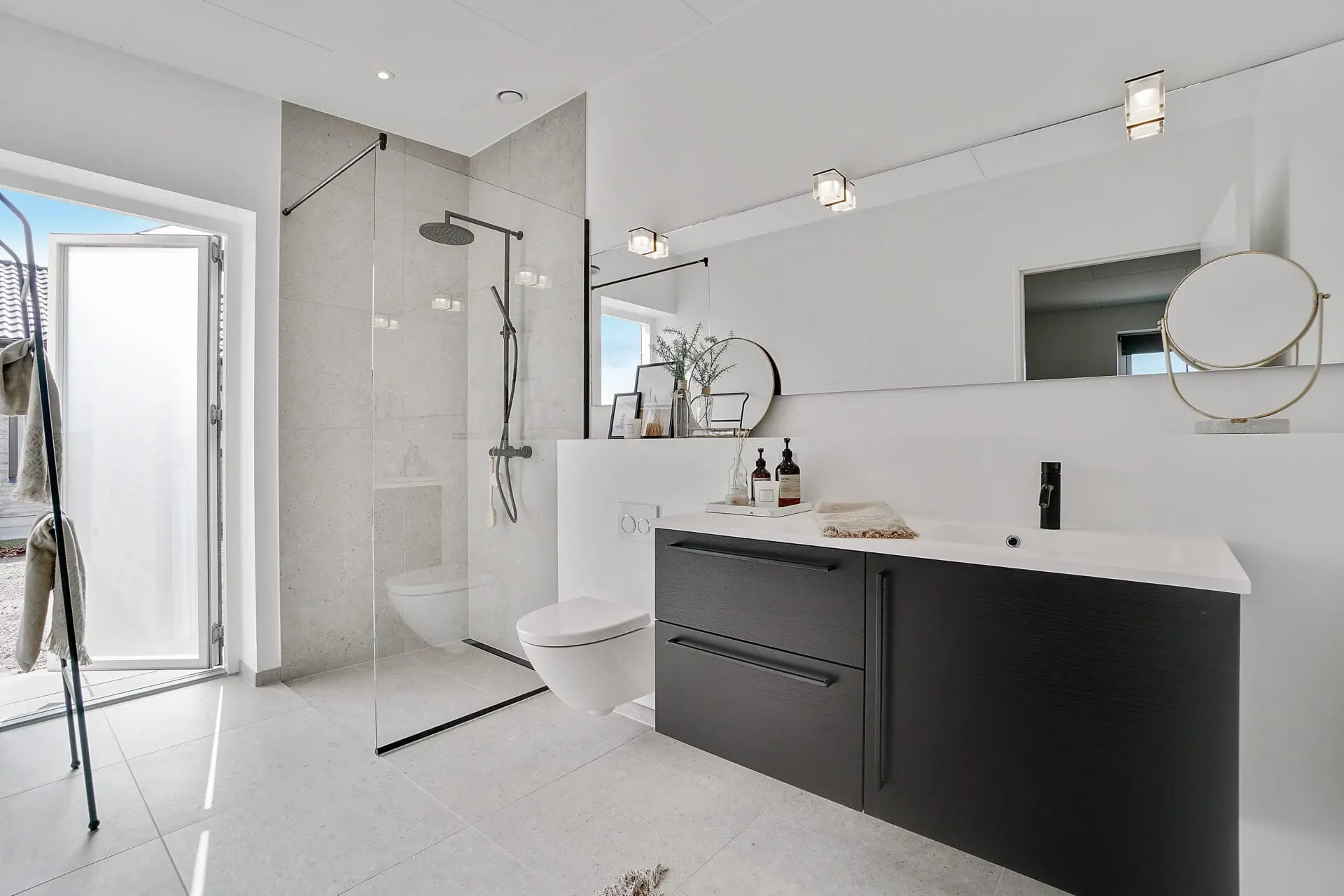 Vores boliger er kendt for deres gennemtænkte indretning – og badeværelset er ingen undtagelse. Vi rådgiver dig i valget af klinker, skuffemoduler, armaturer og spejle, så du får en løsning, der matcher resten af hjemmets stil. I flere af vores huse er der mulighed for terrassedør eller ovenlys i badeværelset – perfekt til lys og luft.