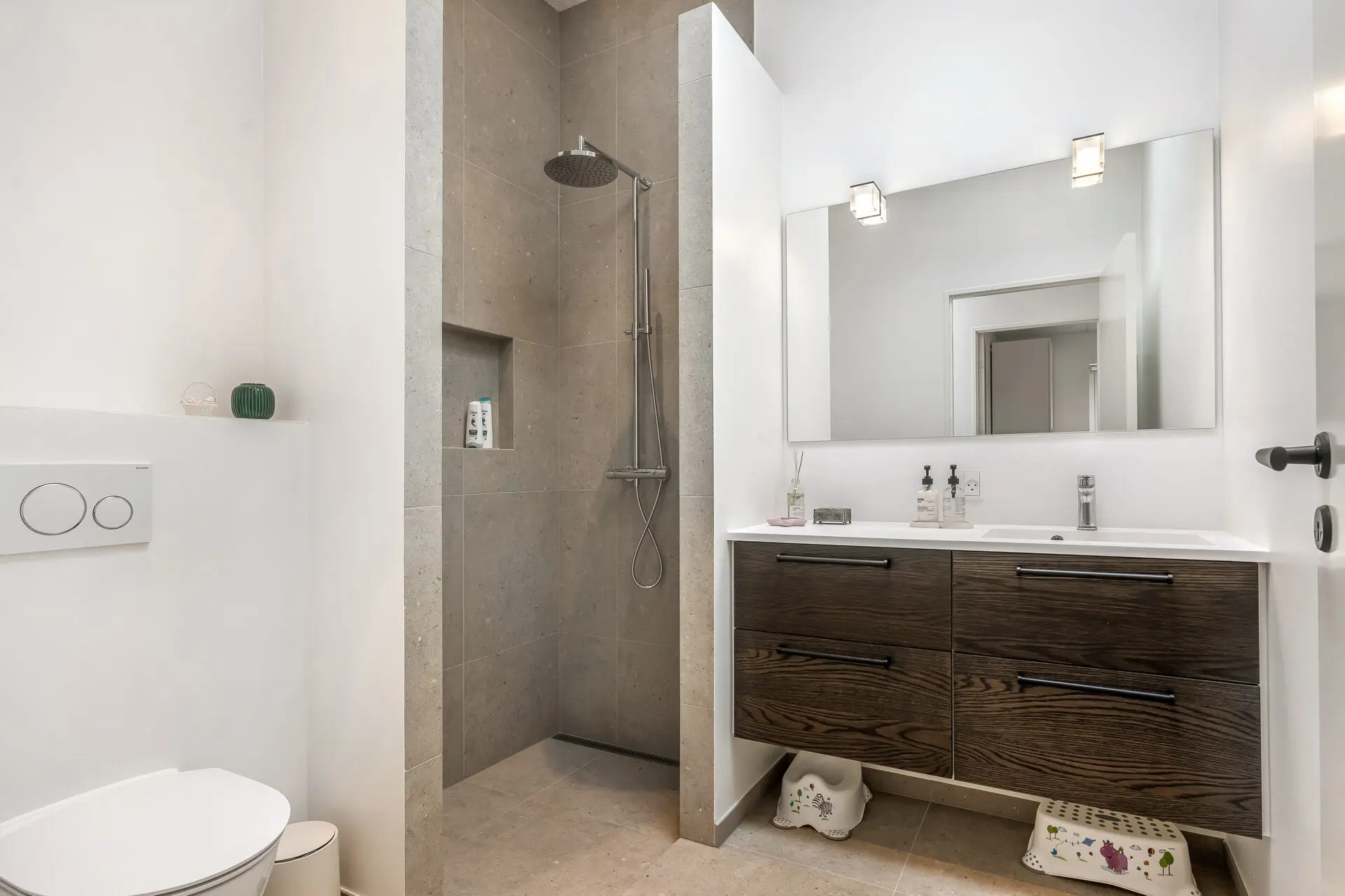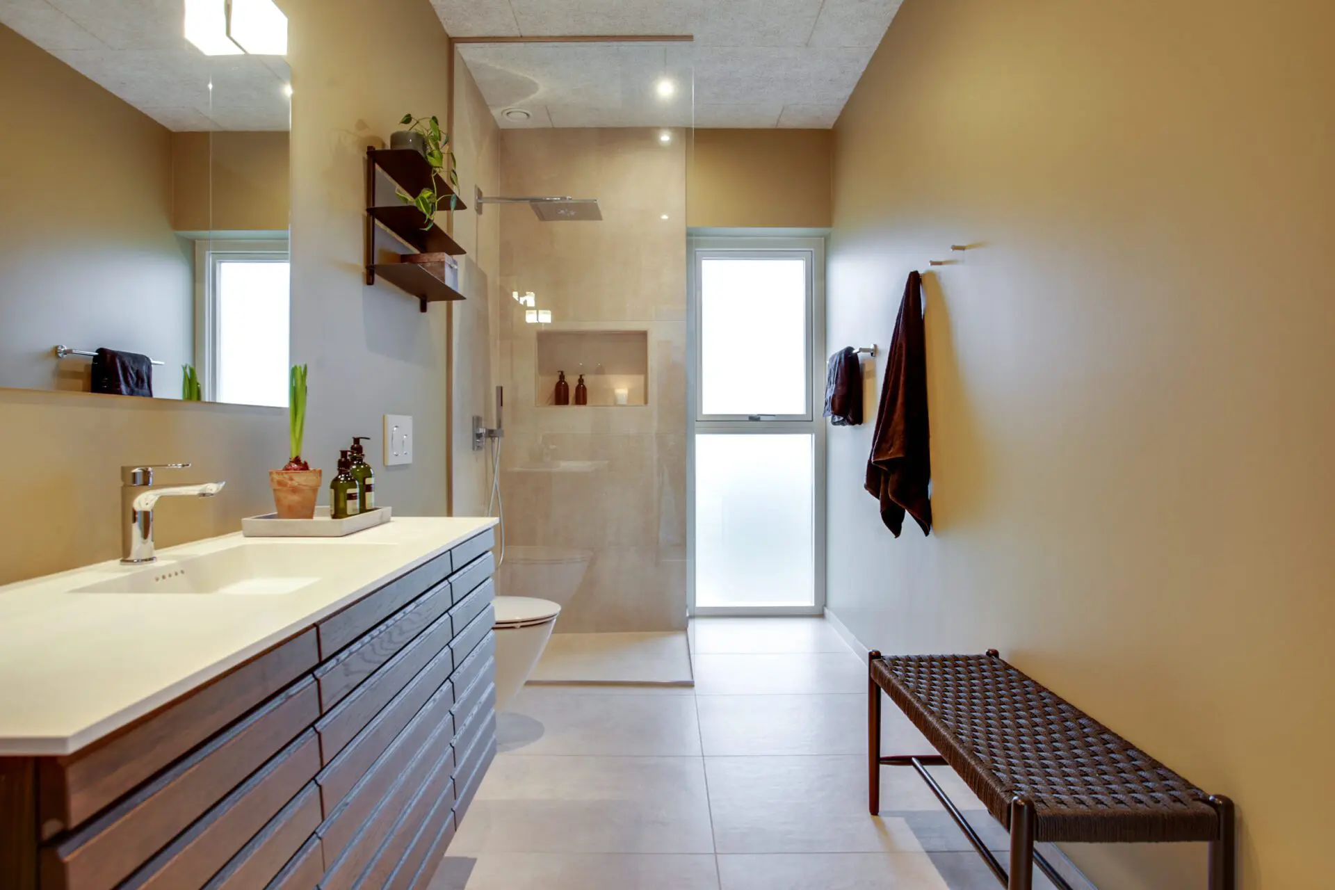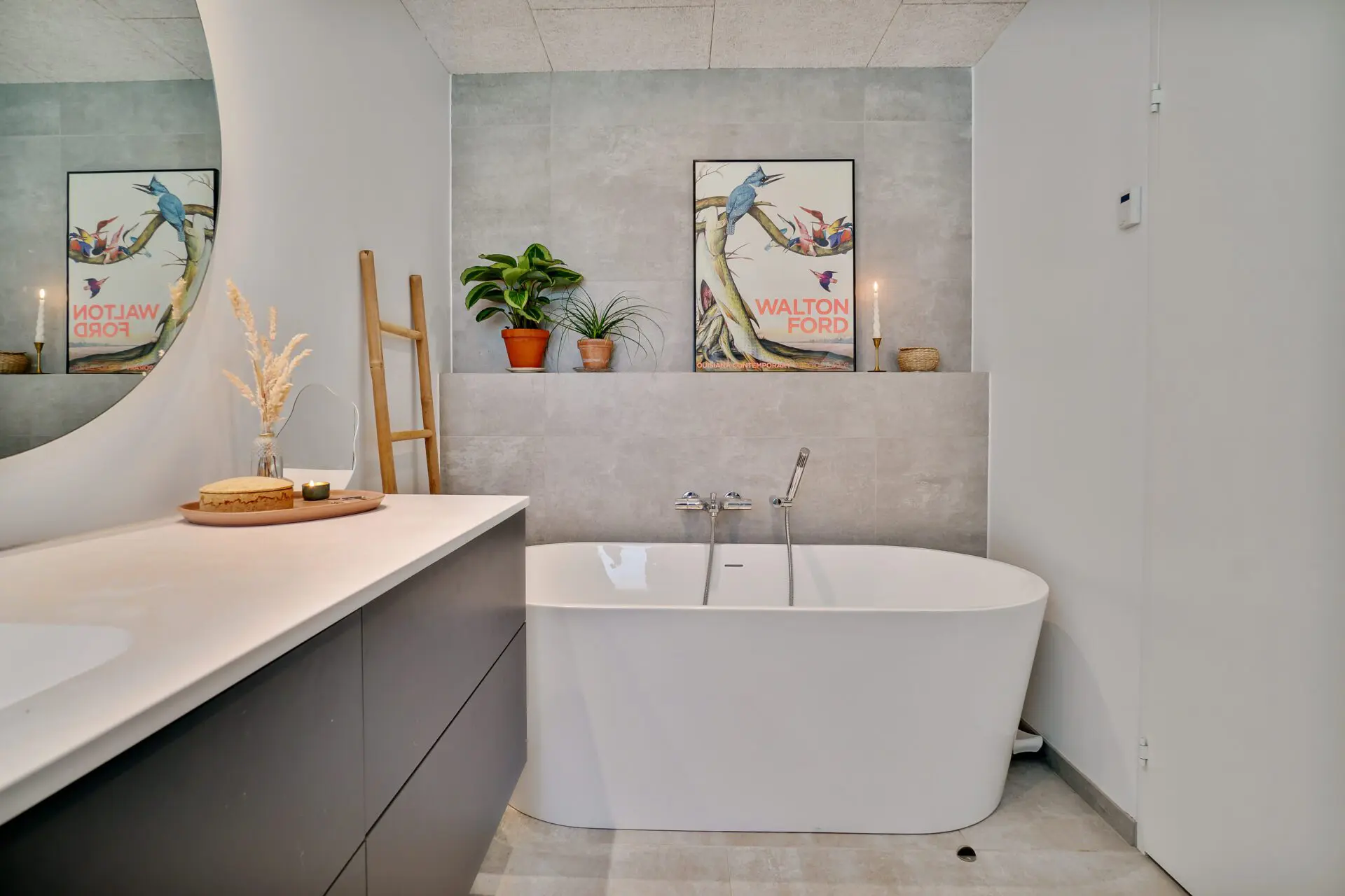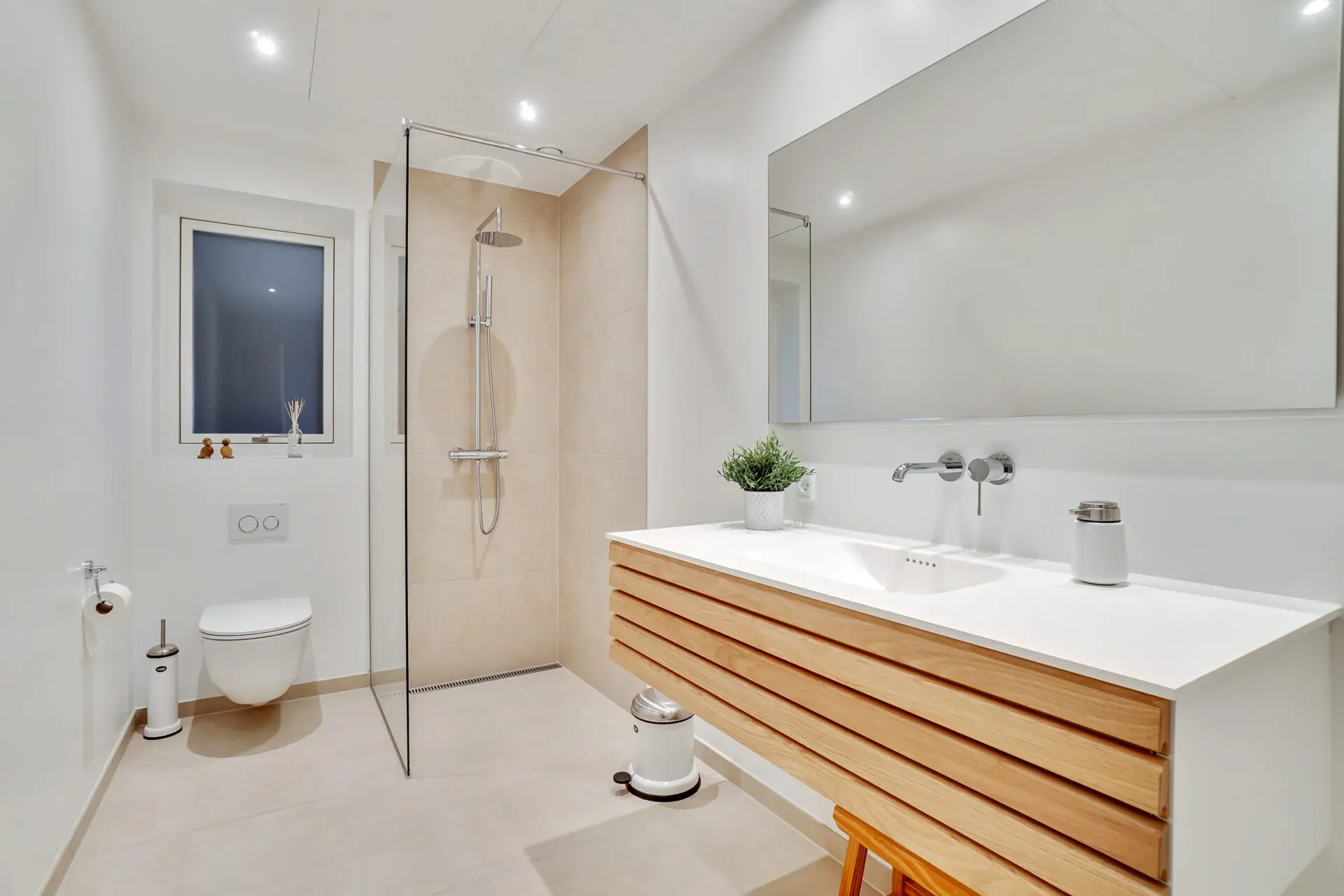 Vores boliger er kendt for deres gennemtænkte indretning – og badeværelset er ingen undtagelse. Vi rådgiver dig i valget af klinker, skuffemoduler, armaturer og spejle, så du får en løsning, der matcher resten af hjemmets stil. I flere af vores huse er der mulighed for terrassedør eller ovenlys i badeværelset – perfekt til lys og luft.