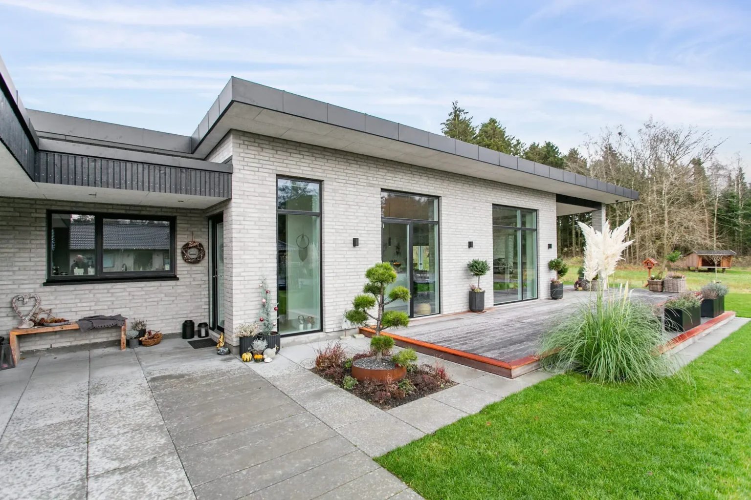 En moderne arkitektonisk stil med skrå tagflader, stærke linjer, spændende detaljer og minimalistisk udtryk.