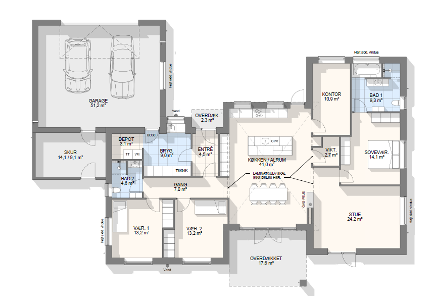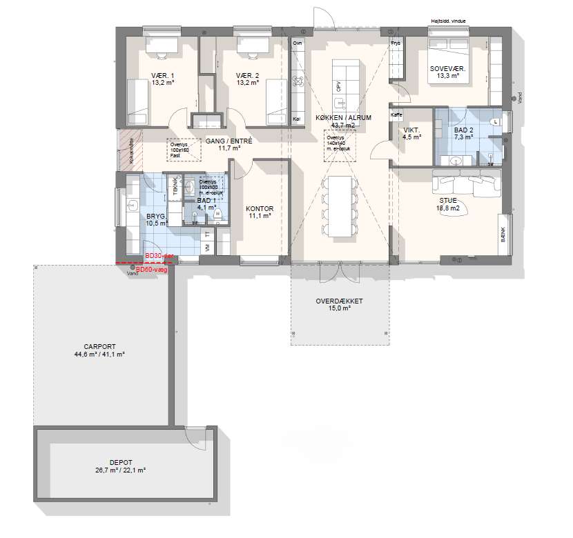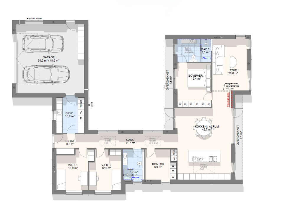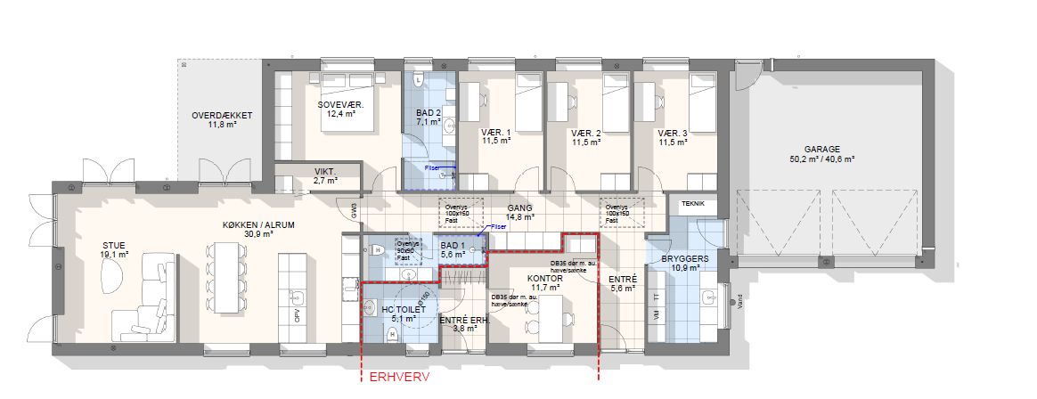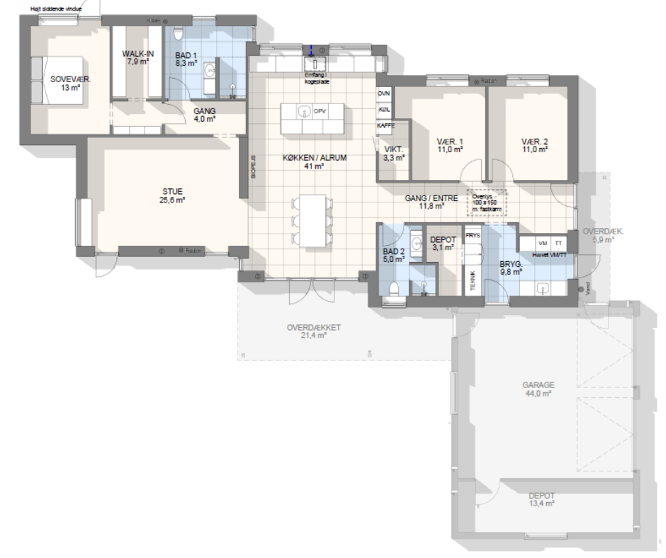 Lad os tage en snak om mulighederne – vi kan tilpasse, spejlvende og justere plantegningen, så den passer præcist til jeres grund og drømme.
