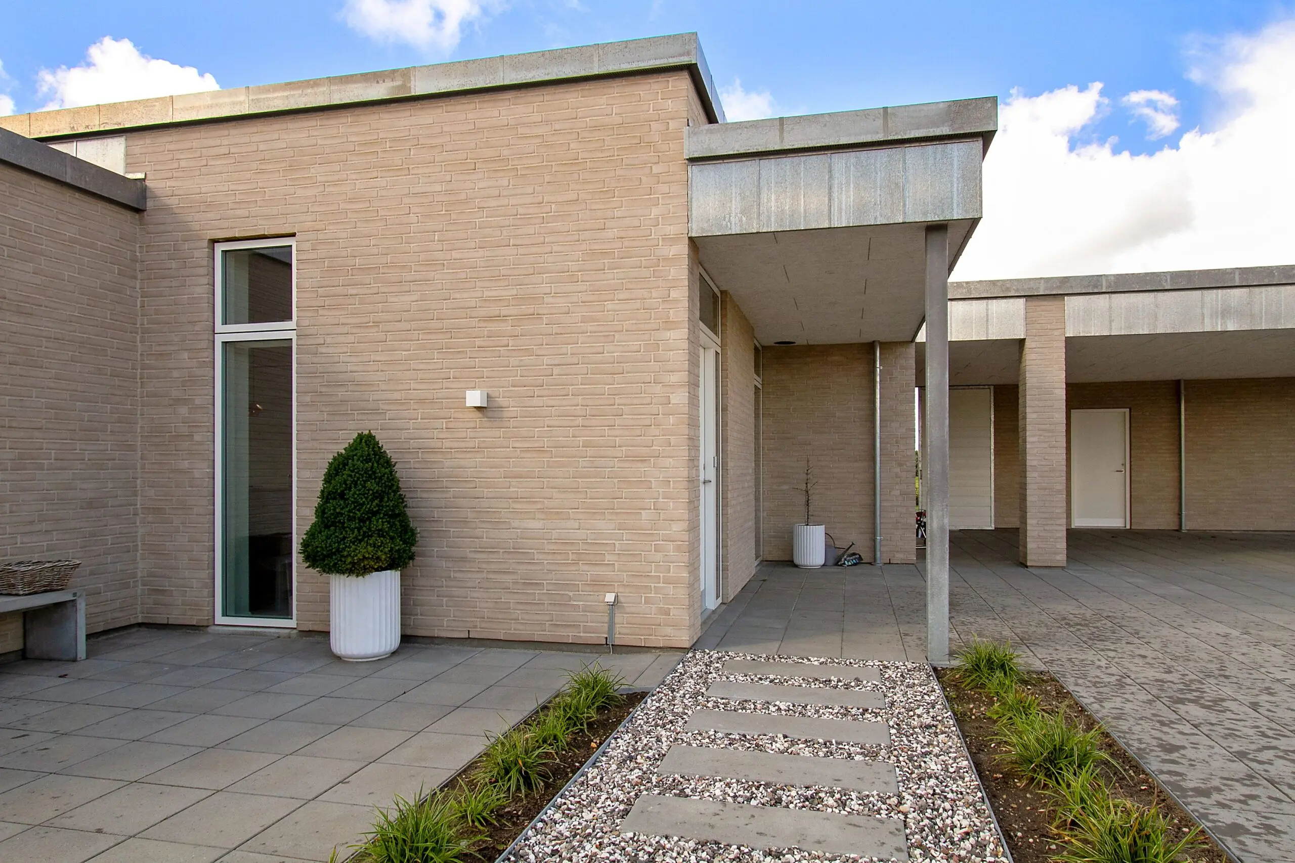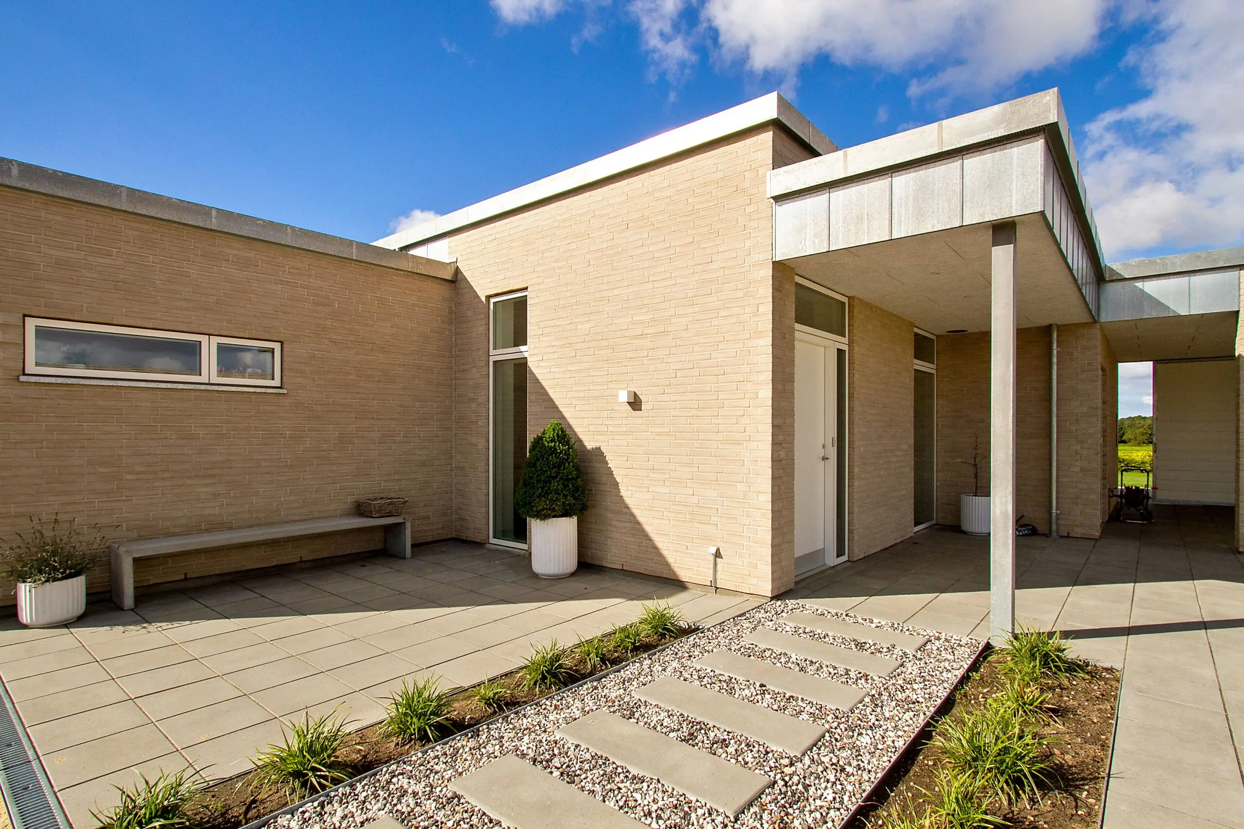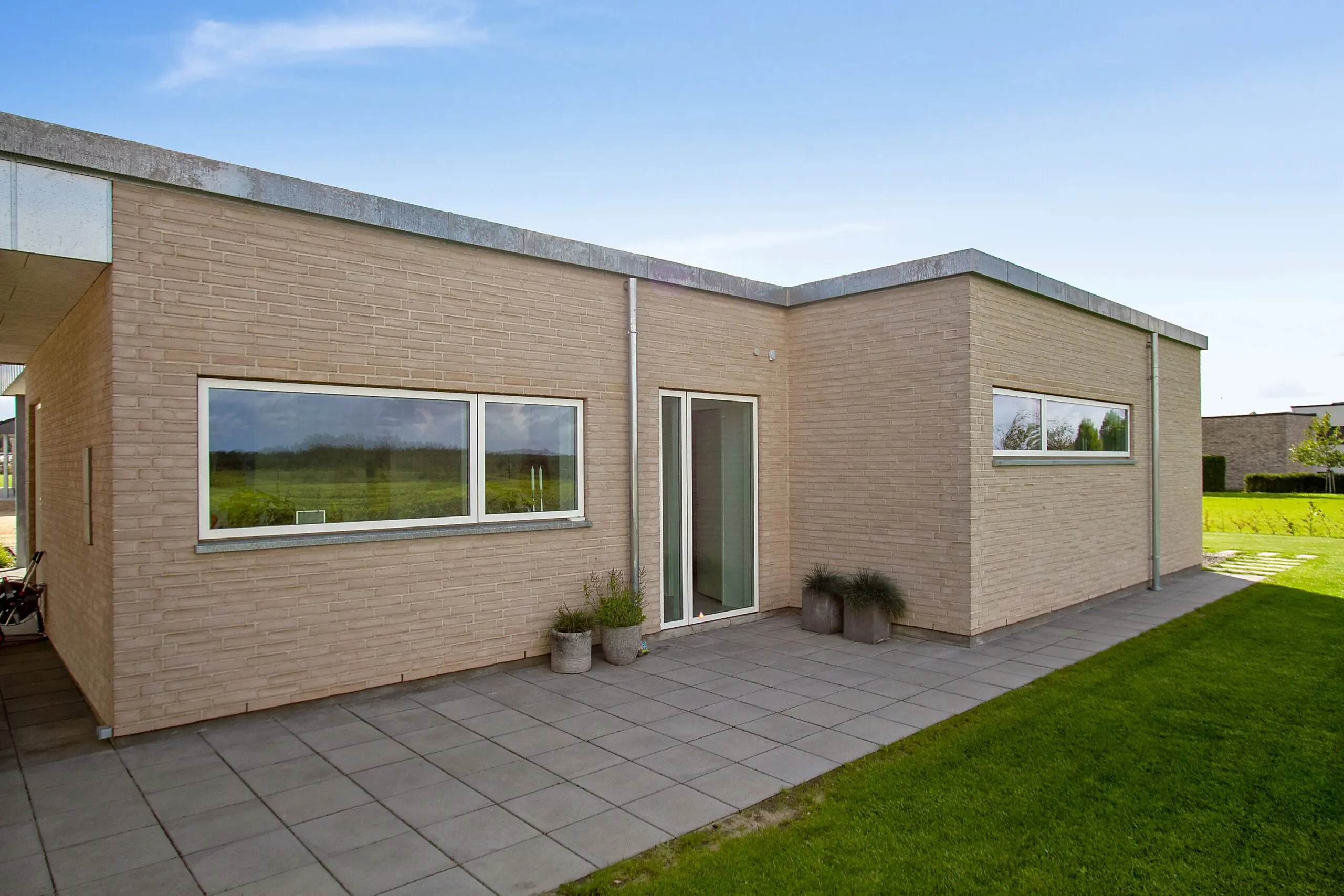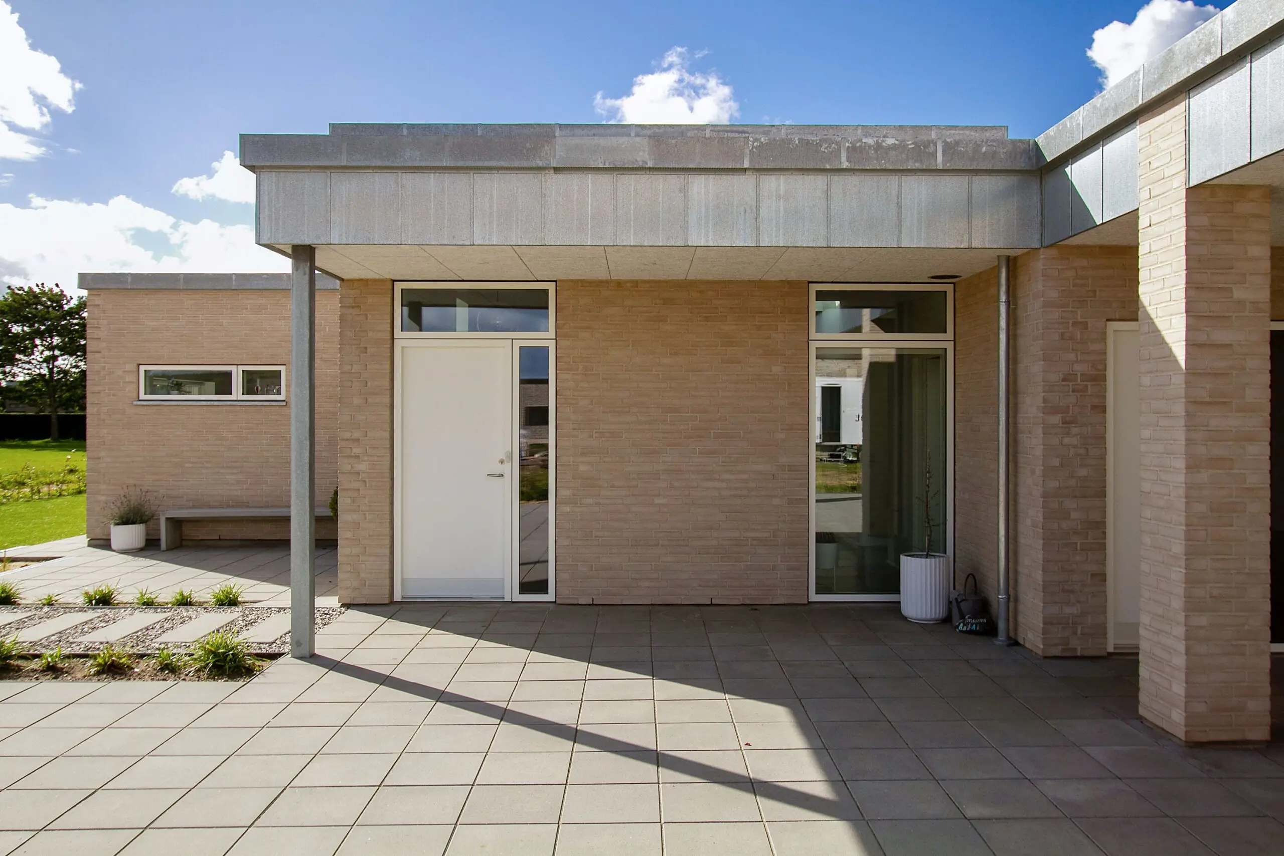 - “Nordisk udtryk” i materialevalg; lys teglsten og hvide vinduer.