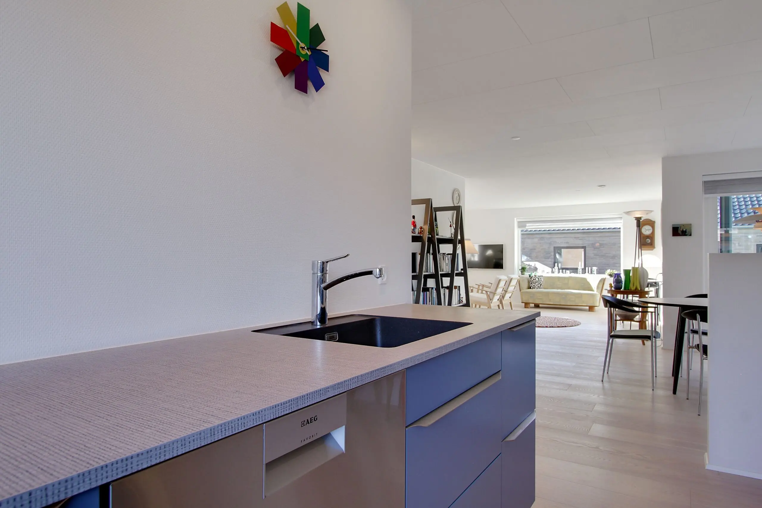 Vi ønskede et hus, der var funktionel uden spildplads, og med et stilrent udseende. En god akustik var vigtig, og det fik vi bl.a. på grund af loftmaterialet og et trælignende gulvmateriale ens i hele huset, og klinker i vådrummene.
