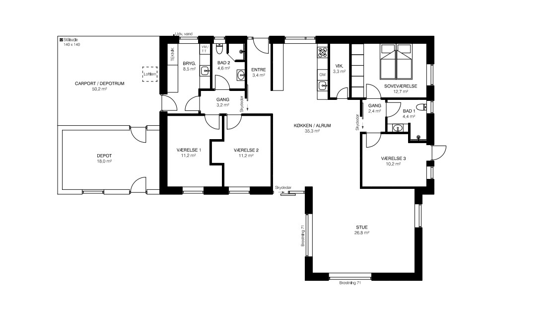 Skydedøre i begge ender af huset lukker af for de to værelsesafdelinger. Køkkenalrum og stue i et i midten af huset fungerer perfekt.