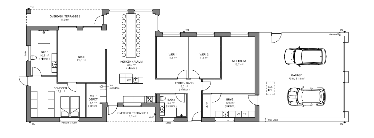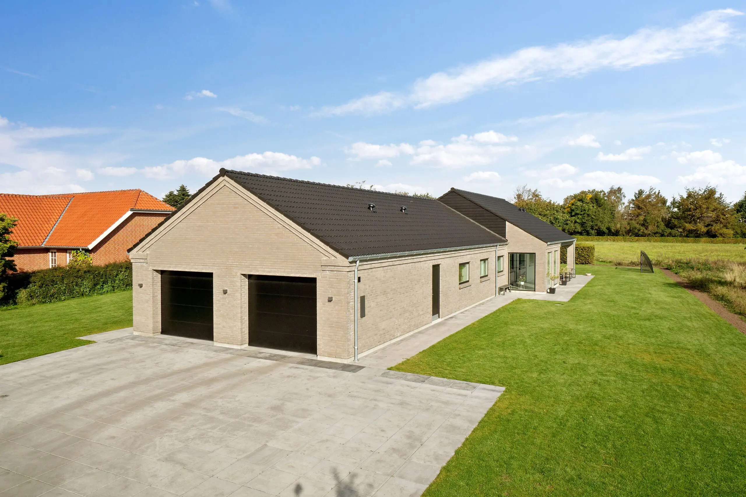 Vi ville gerne have dobbelt garage og havde talt om 50 m², men vi blev anbefalet at lave den større, da vi ikke ville have et redskabsskur. Vi har fået en garage på 70 m² og det har vi ikke fortrudt et sekund, det er så dejligt der er plads til cykler, haveredskaber, børnenes lege ting og selvfølgelig de 2 biler.