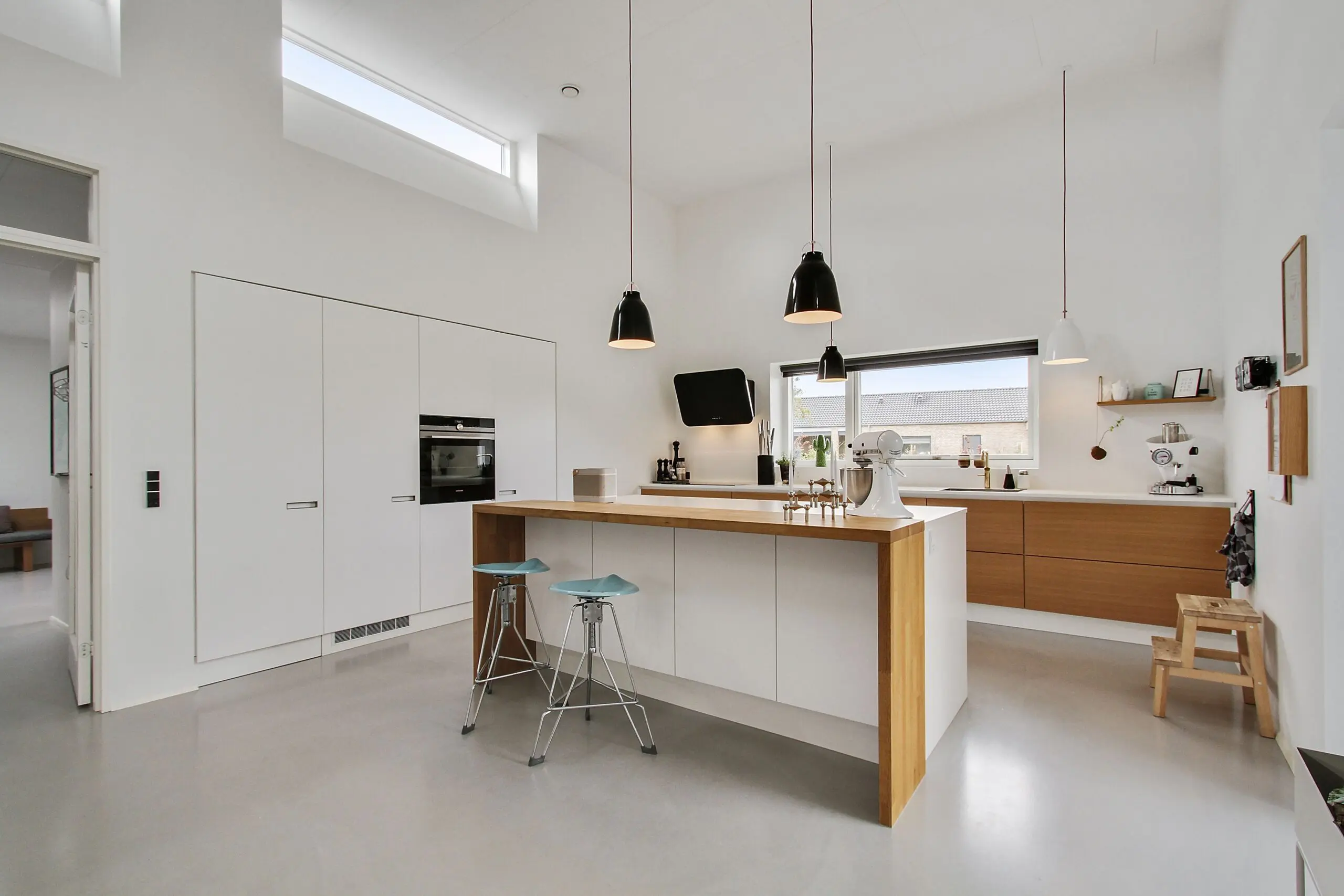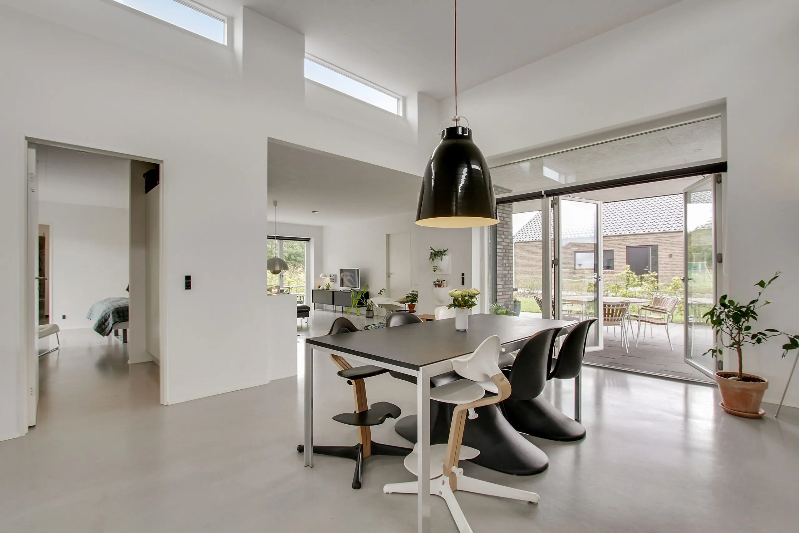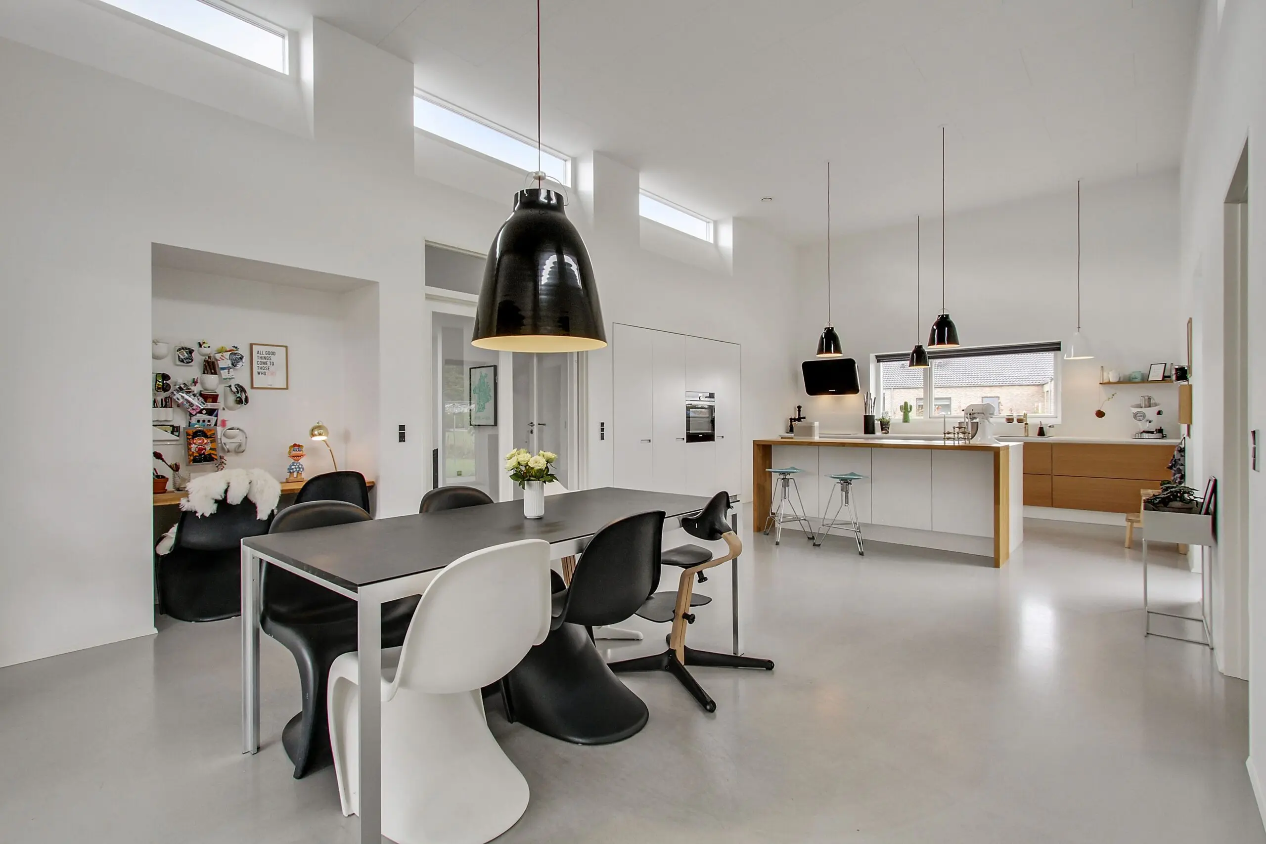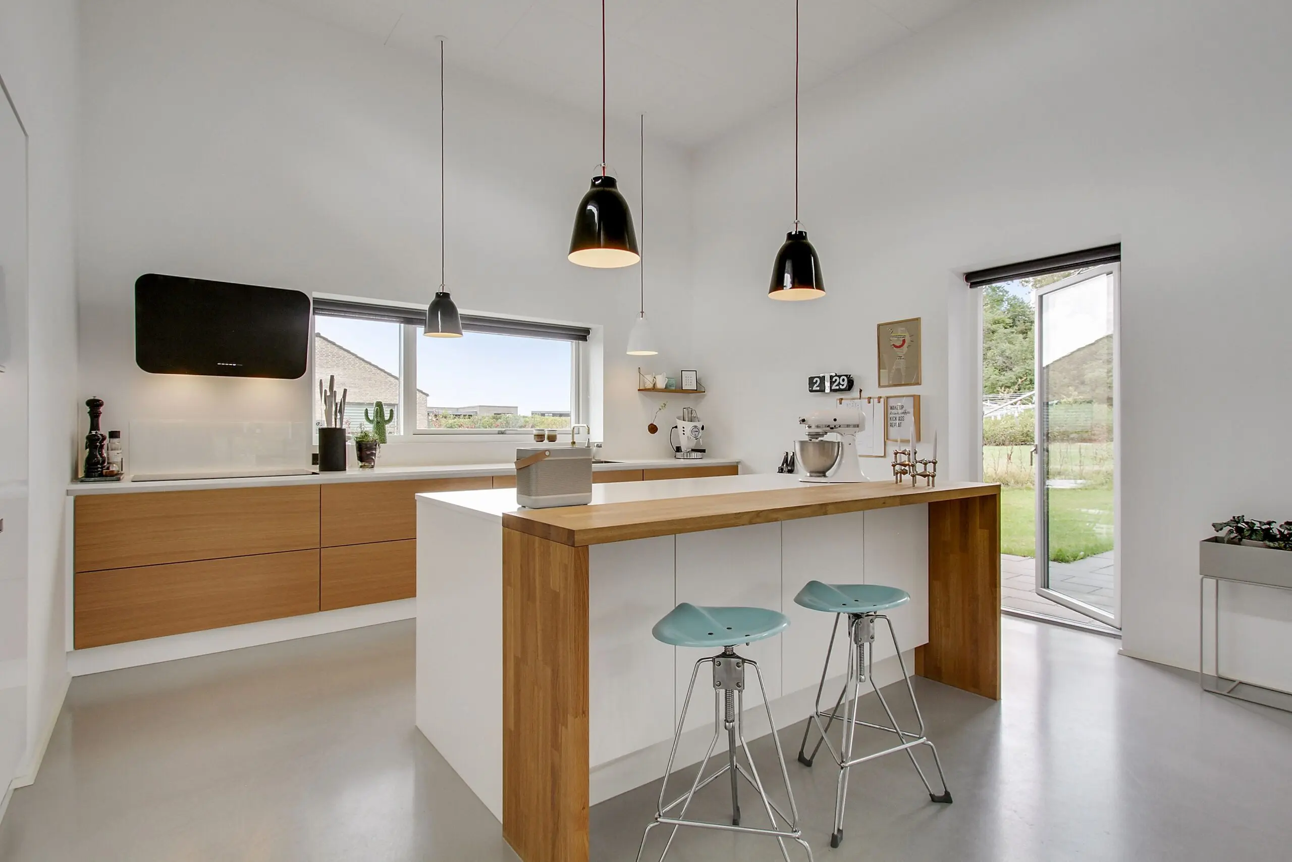 Der har aldrig været tvivl om at vi ønskede et Funkis hus. Det giver mange muligheder i forhold til indretning og så ønskede vi et stort og lyst køkken/alrum, fordi der bliver brugt mange timer netop der.