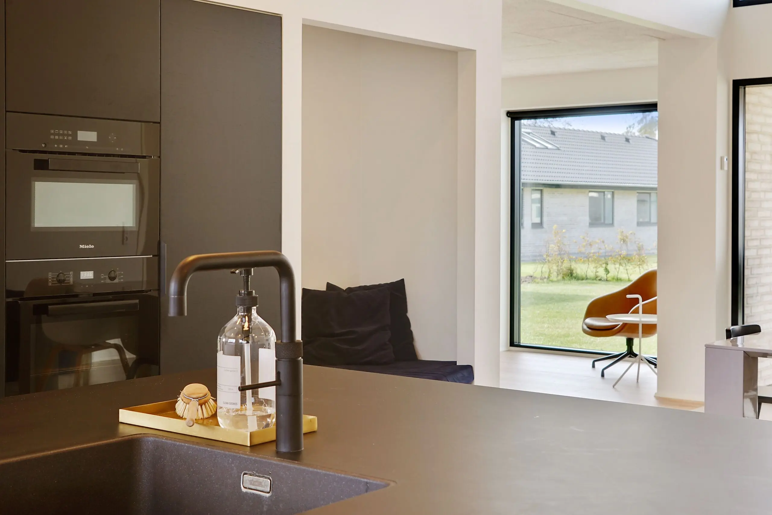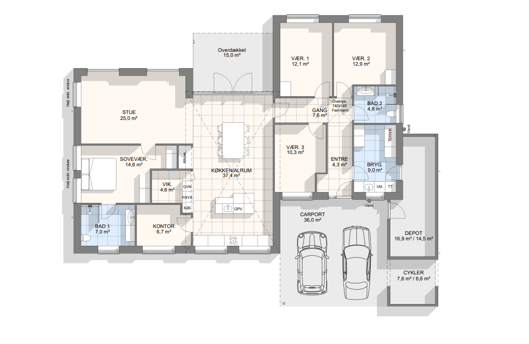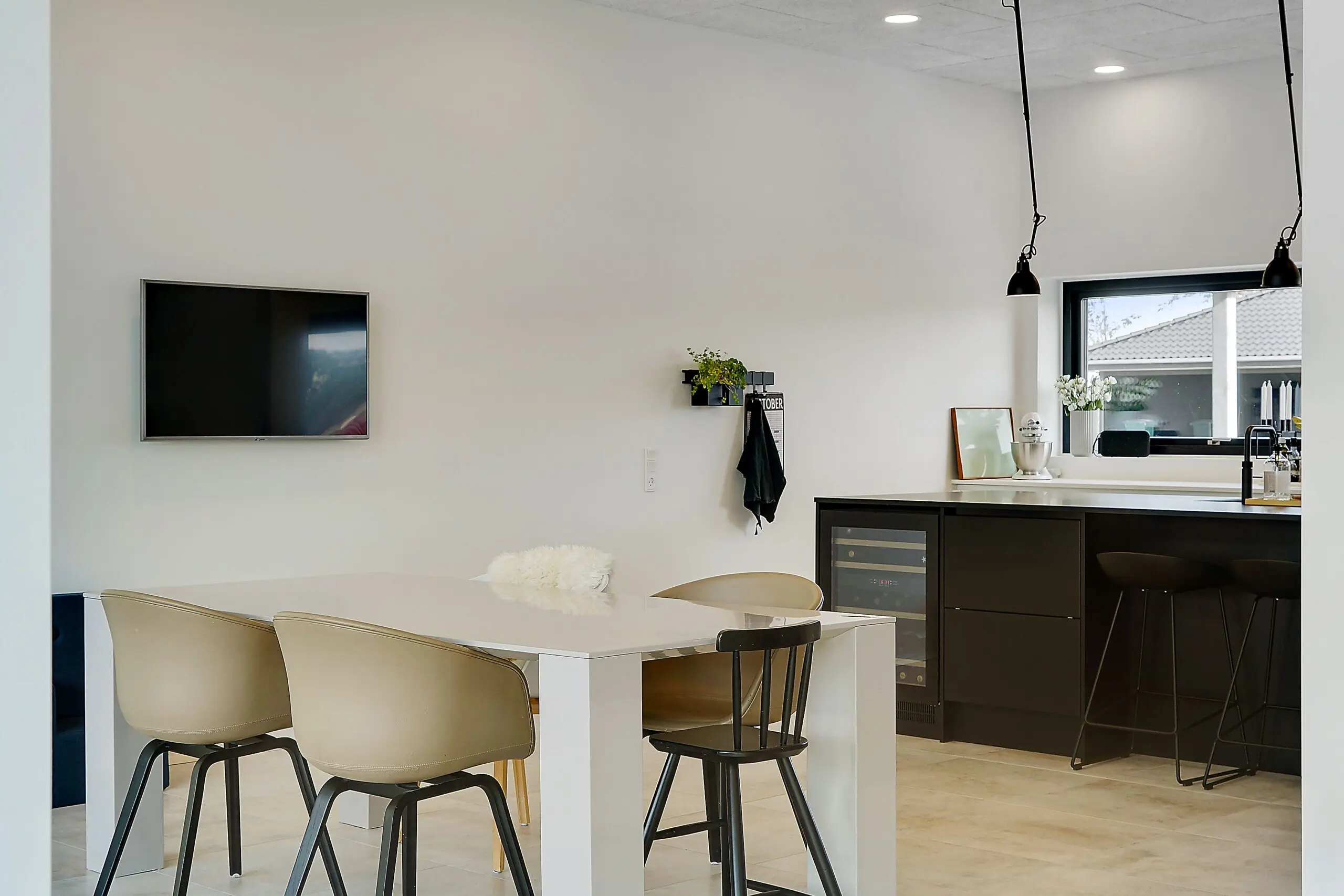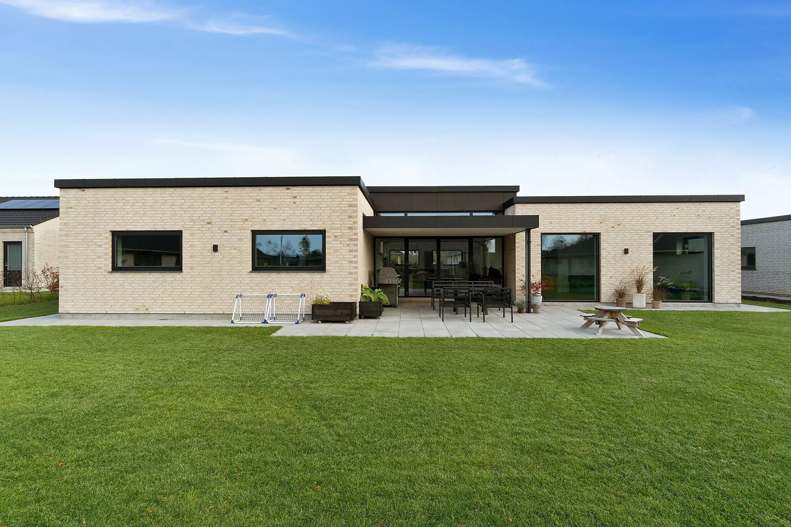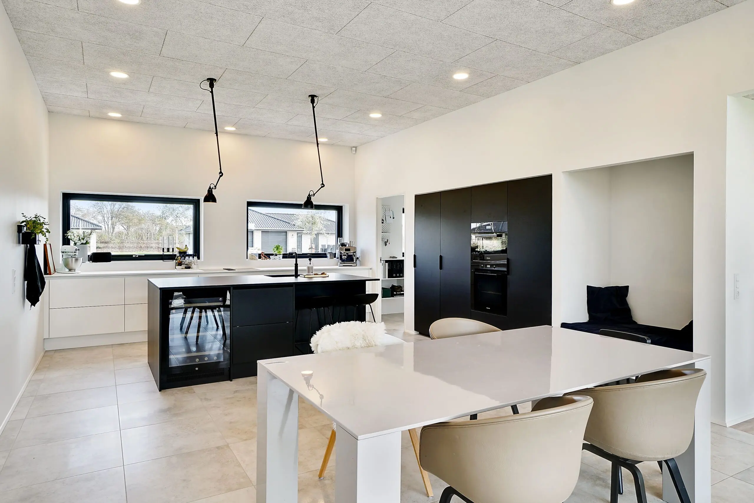 Vi har aldrig været tvivl om at vores drømmehjem var et Funkis hus. Så da vi startede med at tegne, havde vi en lang liste med ting, som var vigtige for os at få med. Højere til loftet i køkken/alrum, troldtekt lofter, viktualierum, alkove, overdækket terrasse, depot med to indgange (så man også har adgang fra huset), carport til to biler (som var bygget sammen med huset) og vestvendt have. Sammen med K2 husets tegner, har vi fået opfyldt alle vores ønsker. Vi bor derfor i dag i et K2 Funkis Flex, som er Tegnet lige efter vores ønsker. Huset er på 187,5 m² med dertil 62,3 m² carport/depot/cykler og 15 m² . overdækket terrasse. Hvis vi skal fremhæve et par ting ved huset, som vi er specielt glade, så er vinduesbåndet over den overdækkede terrasse et af dem. For med de 3 meter indvendigt loftshøjde i køkken/alrum, har vi det smukkeste lysindfald. Derudover har vi valgt at vores Aura Plus Premium vinduer fra Rationel er i farven Noir900 ude og sort inde. Vi synes det giver en smuk ramme omkring de store vinduer, som samtidig bryder med de hvide vægge og lyse gulve. Derudover bryder vinduerne også ude med de lyse sand/naturfarvede mursten B545 Merkur fra Strøger tegl, som har et smukt spil og sammen med den hvide fuge giver det udtryk, som vi har ønsket.