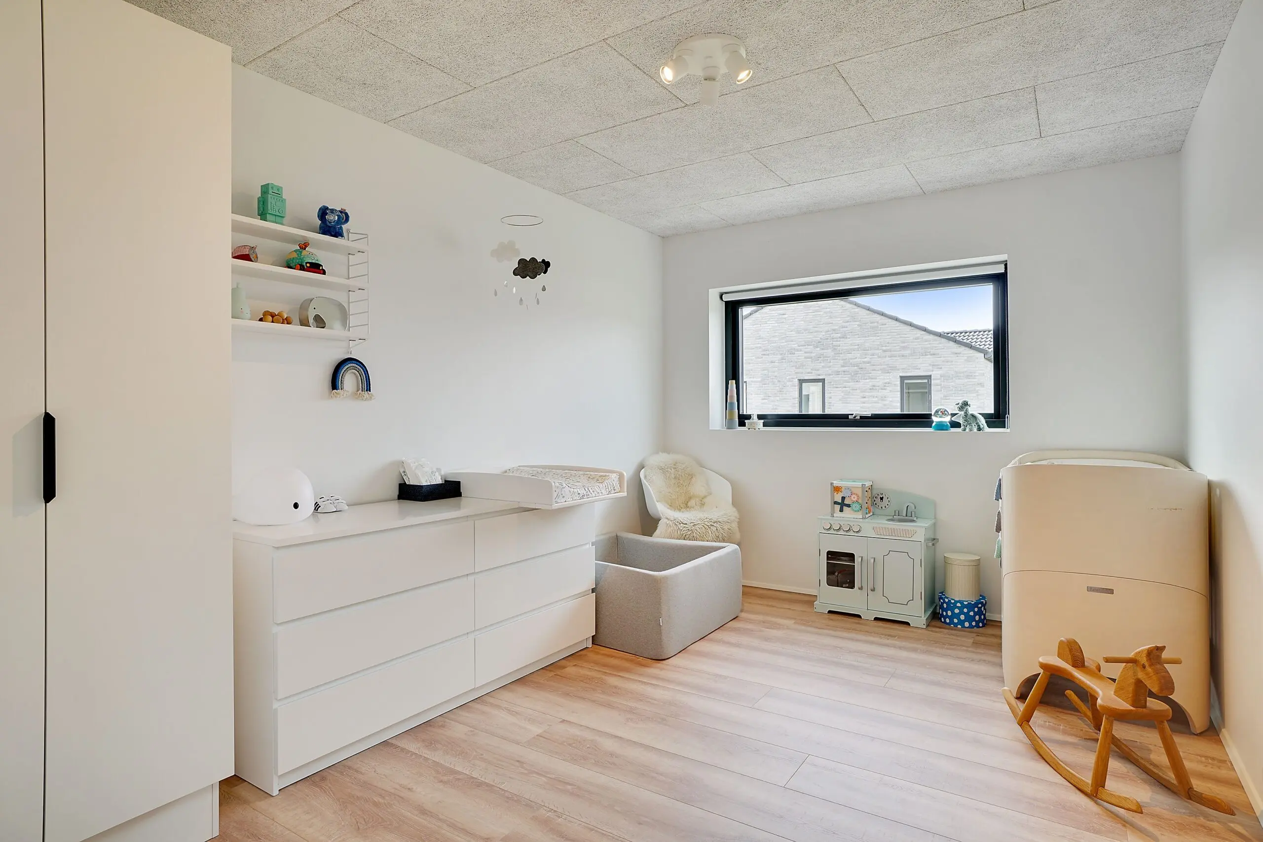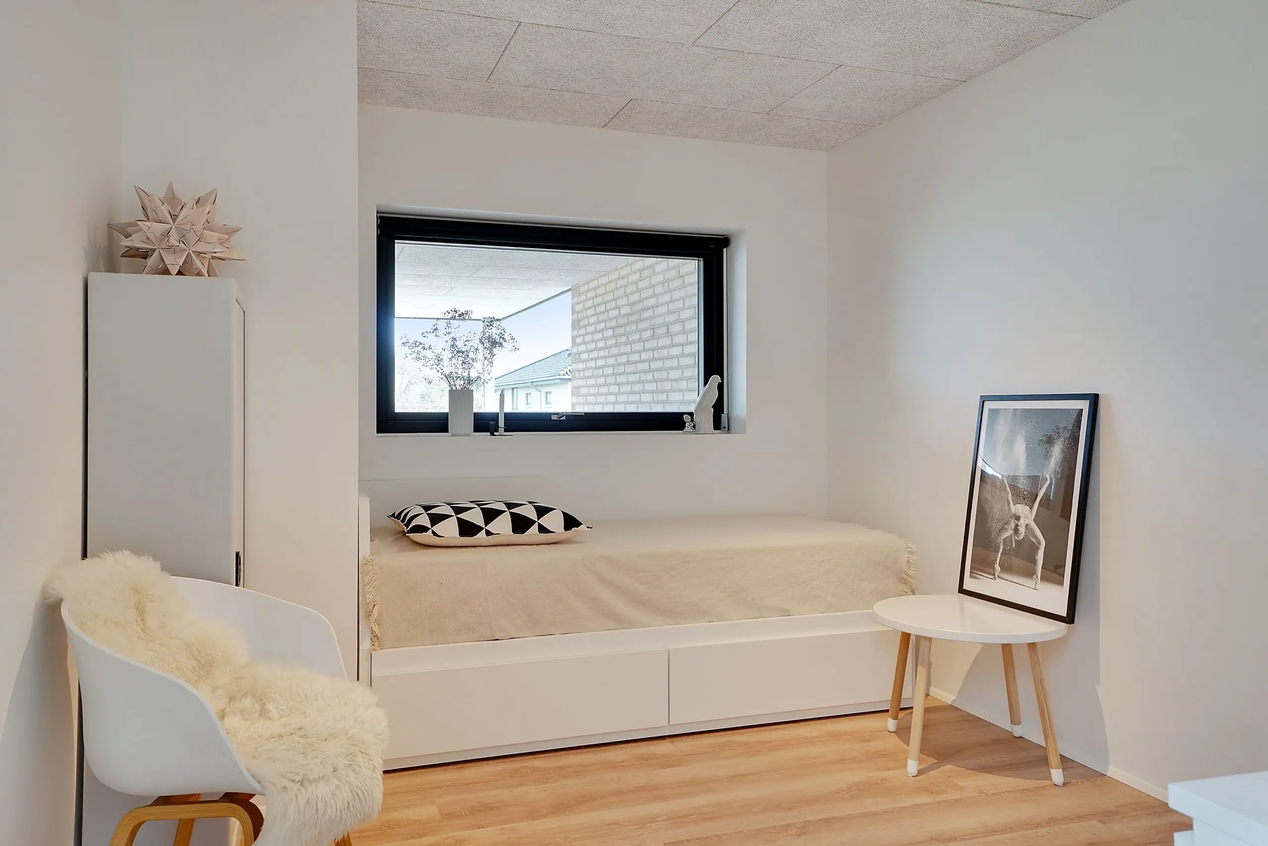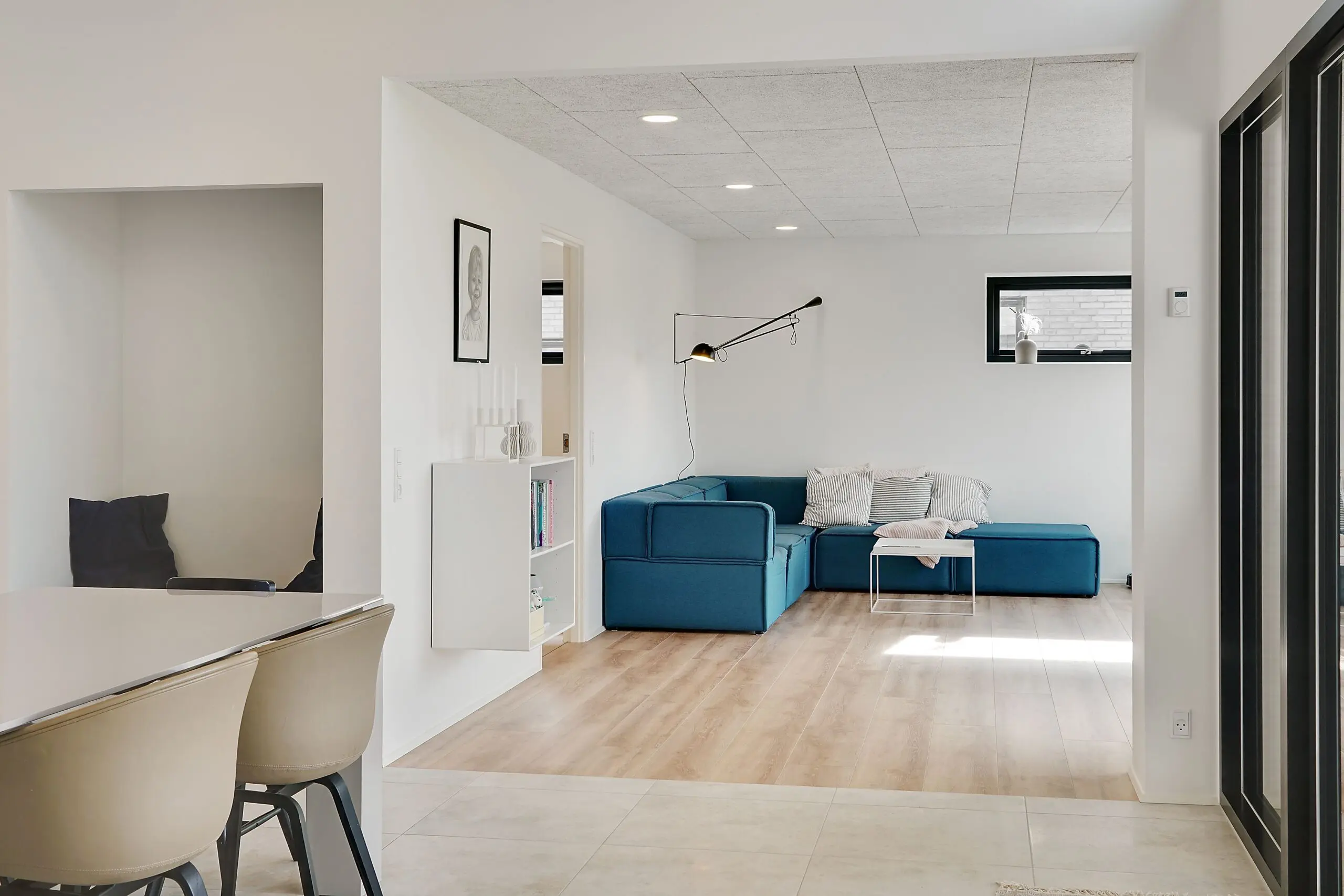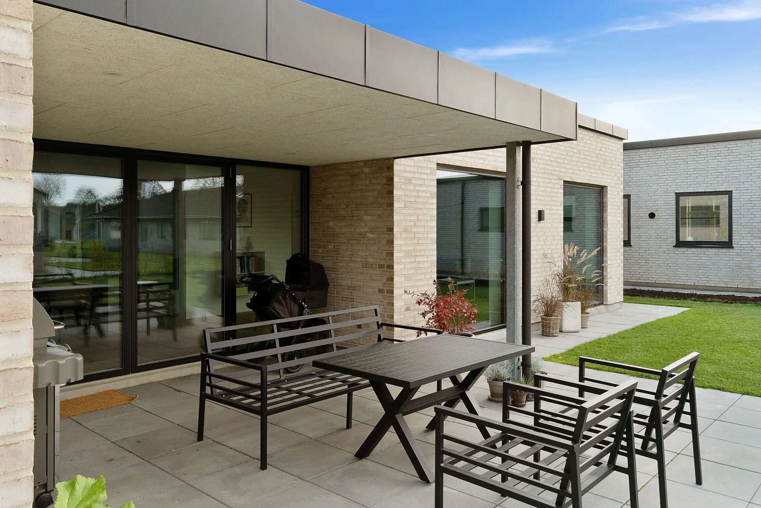 Vi har aldrig været tvivl om at vores drømmehjem var et Funkis hus. Så da vi startede med at tegne, havde vi en lang liste med ting, som var vigtige for os at få med. Højere til loftet i køkken/alrum, troldtekt lofter, viktualierum, alkove, overdækket terrasse, depot med to indgange (så man også har adgang fra huset), carport til to biler (som var bygget sammen med huset) og vestvendt have. Sammen med K2 husets tegner, har vi fået opfyldt alle vores ønsker. Vi bor derfor i dag i et K2 Funkis Flex, som er Tegnet lige efter vores ønsker. Huset er på 187,5 m² med dertil 62,3 m² carport/depot/cykler og 15 m² . overdækket terrasse. Hvis vi skal fremhæve et par ting ved huset, som vi er specielt glade, så er vinduesbåndet over den overdækkede terrasse et af dem. For med de 3 meter indvendigt loftshøjde i køkken/alrum, har vi det smukkeste lysindfald. Derudover har vi valgt at vores Aura Plus Premium vinduer fra Rationel er i farven Noir900 ude og sort inde. Vi synes det giver en smuk ramme omkring de store vinduer, som samtidig bryder med de hvide vægge og lyse gulve. Derudover bryder vinduerne også ude med de lyse sand/naturfarvede mursten B545 Merkur fra Strøger tegl, som har et smukt spil og sammen med den hvide fuge giver det udtryk, som vi har ønsket.