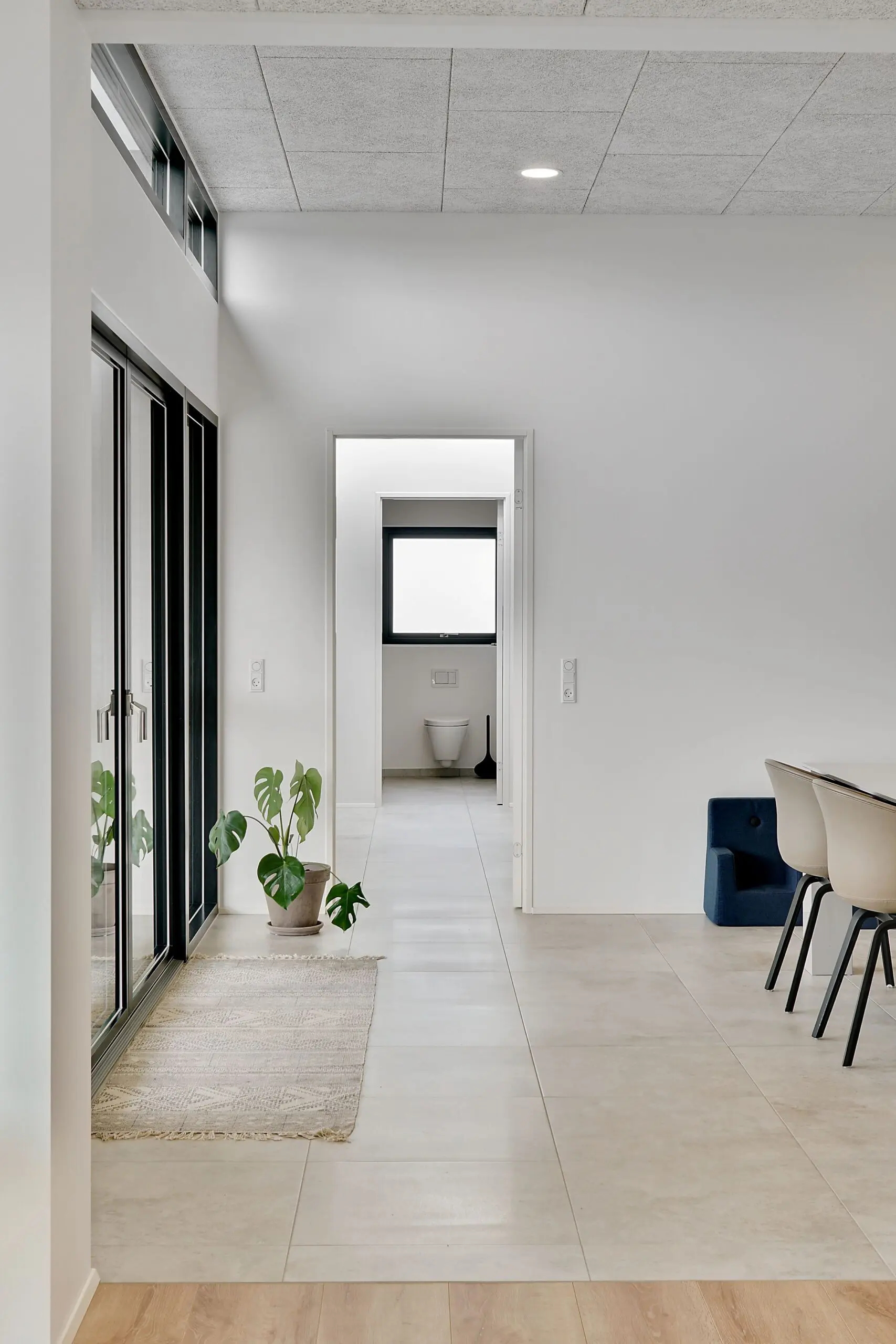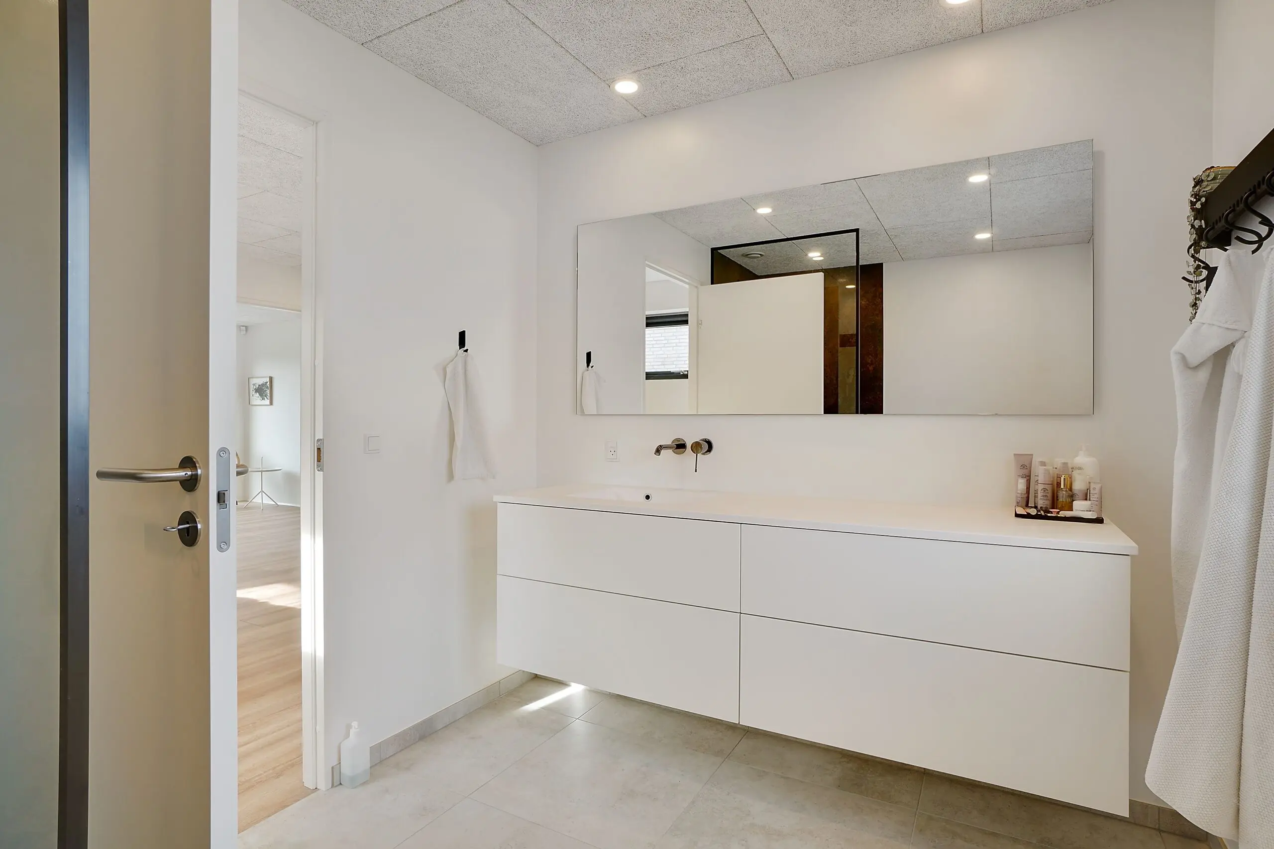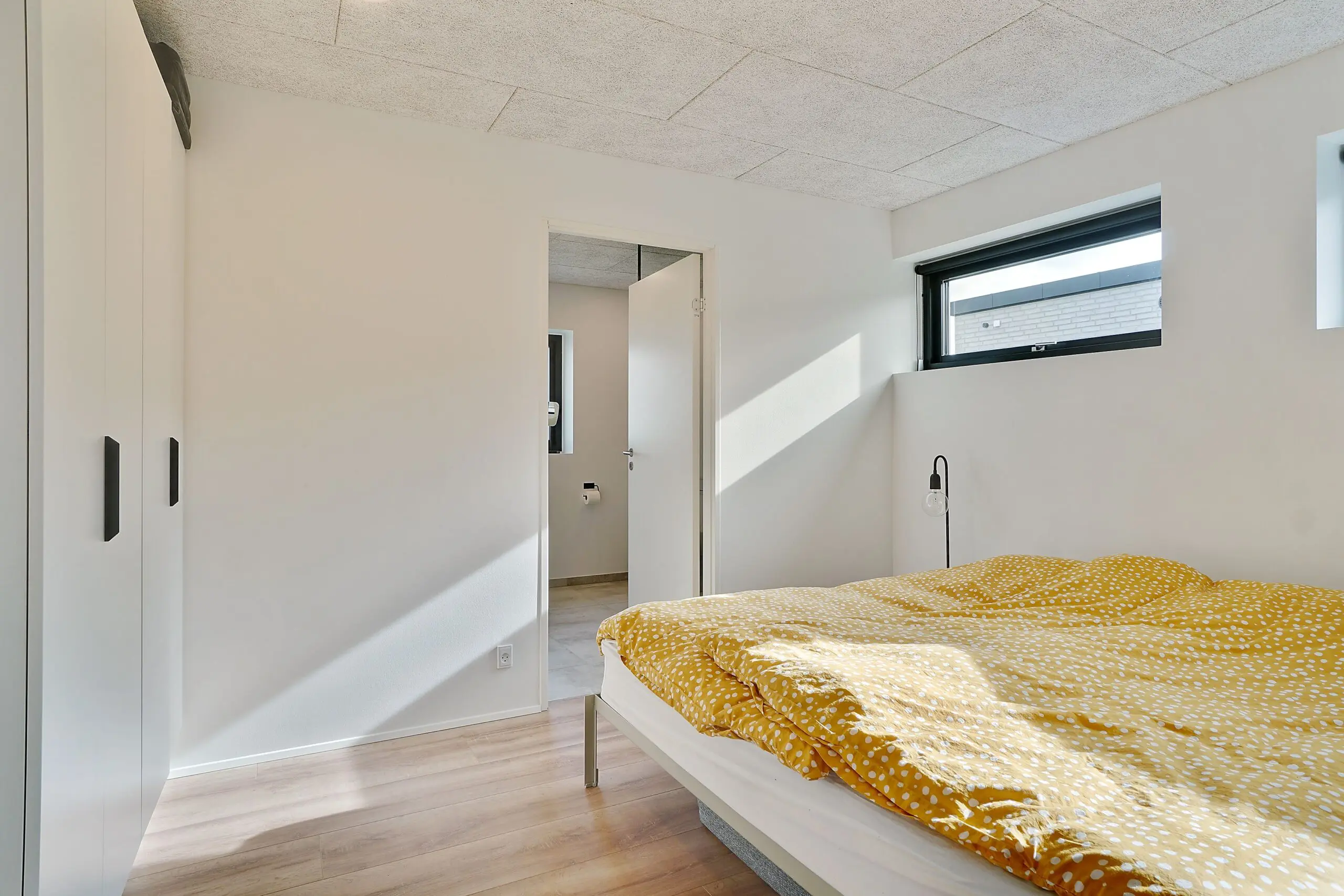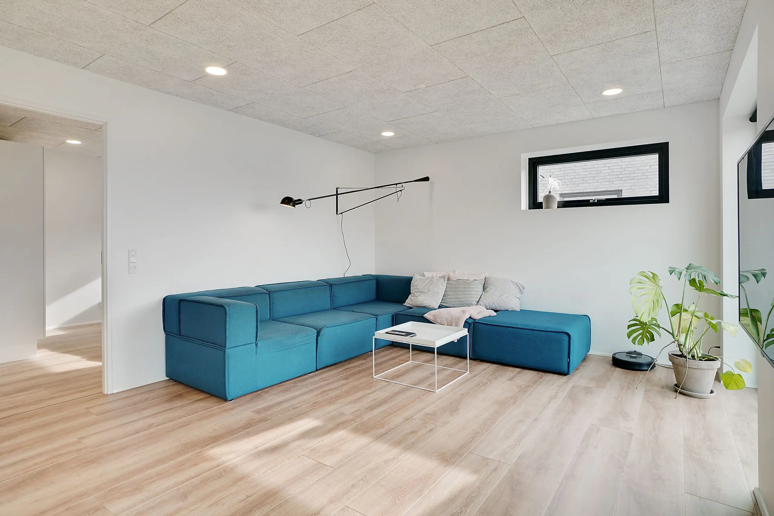 Vi har aldrig været tvivl om at vores drømmehjem var et Funkis hus. Så da vi startede med at tegne, havde vi en lang liste med ting, som var vigtige for os at få med. Højere til loftet i køkken/alrum, troldtekt lofter, viktualierum, alkove, overdækket terrasse, depot med to indgange (så man også har adgang fra huset), carport til to biler (som var bygget sammen med huset) og vestvendt have. Sammen med K2 husets tegner, har vi fået opfyldt alle vores ønsker. Vi bor derfor i dag i et K2 Funkis Flex, som er Tegnet lige efter vores ønsker. Huset er på 187,5 m² med dertil 62,3 m² carport/depot/cykler og 15 m² . overdækket terrasse. Hvis vi skal fremhæve et par ting ved huset, som vi er specielt glade, så er vinduesbåndet over den overdækkede terrasse et af dem. For med de 3 meter indvendigt loftshøjde i køkken/alrum, har vi det smukkeste lysindfald. Derudover har vi valgt at vores Aura Plus Premium vinduer fra Rationel er i farven Noir900 ude og sort inde. Vi synes det giver en smuk ramme omkring de store vinduer, som samtidig bryder med de hvide vægge og lyse gulve. Derudover bryder vinduerne også ude med de lyse sand/naturfarvede mursten B545 Merkur fra Strøger tegl, som har et smukt spil og sammen med den hvide fuge giver det udtryk, som vi har ønsket.
