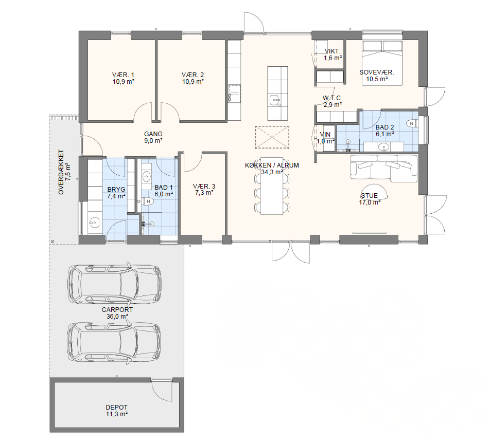 Huset har et stort og lyst køkken/alrum, en hyggelig stue og gode børneværelser, der gør det ideelt til familieliv. Med detaljer som ovenlysvinduer, overdækket terrasse og udendørs alkove mod havesiden får du en ærlig oplevelse af, hvordan et funkishus kan bruges i hverdagen.